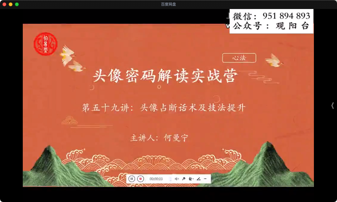 何曼宁头像密码解读实战训练营课程视频,约十九章内容,但核对数序的话可能缺着第十七章的内容。本课优势 见证‬神奇 见微知著、铁口直断,现场‬分析头像,见证何老师的技术,即学即用 每个知识点都有对应‬的案例,何老师 亲自‬带领大家给出‬断语课后作业 每天课程结束后都有当天的试题内容, 学‬过了更要记住,活学活用量金高 课程内容丰富、知‬识落点地、老师思维广泛、好学好用‬好评如潮师思维‬太开阔知识点广泛,越学习后的共同感受,老师讲的太好了,过瘾!