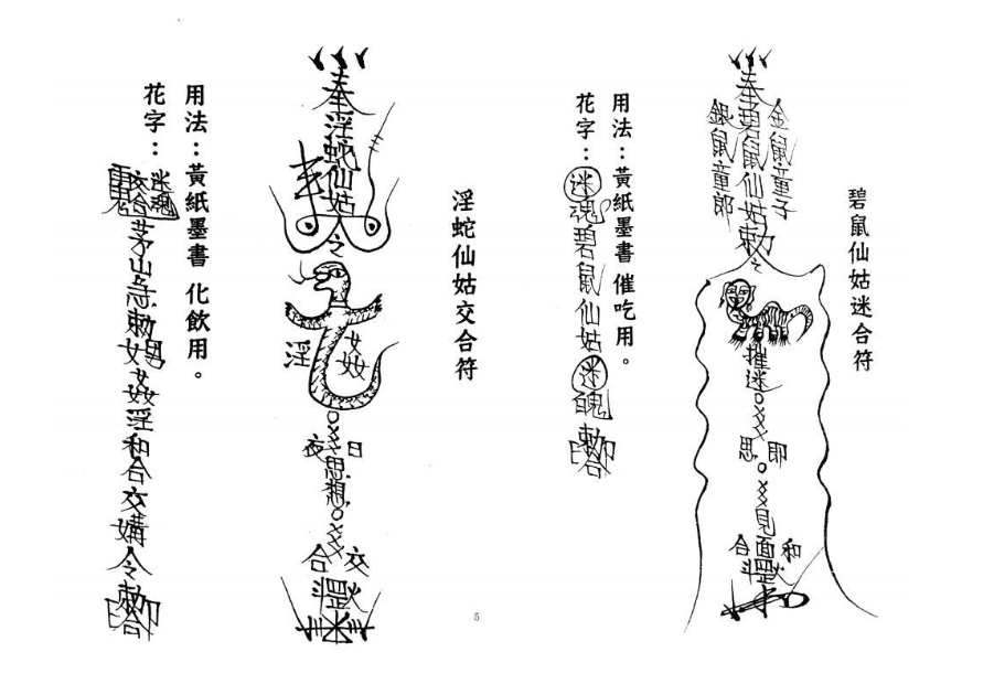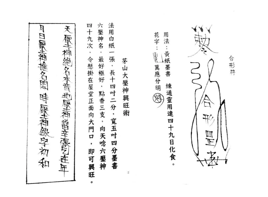 大概内容如下:合形符、茅山大壓神兴旺术、制流财煞符、催阴魂运财符、桃花符、易颜符、碧鼠仙姑迷合符、淫蛇仙姑交合符、阴阳吊魂符、吊回符、金蝉迷合符、女蝠鬼迷合符、猪哥仙师迷合符、蜈蚣迷合符、阴阳司鬼催迷符、阴阳三司催合符、芙蓉仙姑催迷符、五鬼催合符、白猿神师催迷符、蜘蛛迷魂符、龙虎旺财符、阴山追人回家符、招财符、招客服、茅山五阴催财符、金母招财兴旺符、地藏消炎延寿富贵符、凤阳招财符、旺店招财符、招财旺坛符、消炎大吉利符、猪哥迷花客符、邪合乱心符、桃花驛马迷情符、迷魂符、巫门大乐符术、女巫闺房术、回心同心符、五阴神和合符、和合仙师催合符、八马富贵符、八马财源广进符、解锁坛符、旺店招财符、堵财符、赌博得利符、偏财符、断嫖赌符、禁止小人口舌符、如意符、黑虎吊回符、招财客符、押头助符、贵人符、改个性符、教乖押性符、服从符、打回头兵符、蓋魂符、藏身符、镇邪百无禁忌符、禁路符、金头将军收邪斩邪符、食鬼吞精符、治贼符、治心肝痛符、发兵符、打煞符、虎将虎符、五雷古符、五雷制煞符、五方雷符、镇煞符、保身符、治吞白虎煞符、斩是非口舌符、斩狐妖符、伤贼脚符、伤贼眼符、追捉贼符、治犯邪心神不定符、制邪符、玄天上帝门法破邪符、盘古大帝破邪符、解锁符、犁头符、地网符、治邪魔不进神隔煞符、三奶夫人护身符、钟魁押煞斩邪符、草人替身符、止血符、五雷招魂符、安魂定魄符、带信通知符、五年千岁治癫狂收邪妖符、五年千岁治阴毒符、五年千岁镇煞符、双面蛇姑治邪师符、双头蛇神治邪符、五鬼治邪师钉脚符、阴山借兵符、壓五鬼符、茅山真传护身总符、三山九候治久病邪症符、三山九候保命护身符、三山九候驱邪押煞符、三山九候收魂符、救急病或重病符、三山九候斩邪符、九天玄女招财符、文武财神招财符、狐仙引花客符、光明星君符、升官考试符、学业光明符、逐人符、用功读书符、玉皇赦罪符、定心符、治邪病符、治癫狂符、茅山隔小人符、神兵听话符、收退五方阴兵阴将灵符、镇元辰光彩符、小儿保身符、讨债符、化冤仇符、安公妈符、治夜睡噩梦符、阴山行兵术、阴山门收阴兵回坛秘法、杨公收土煞符、黑虎煞神咬死恶人符、三煞神符、除鬼符、押煞斩鬼符、打邪魔鬼符、七星八卦收邪符、北极康赵元帅治邪鬼符、无忌符、六壬兵马符、法师门法封身符、天罗地网符、制服夜鬼符、双坛符、起馆行兵符、等等……