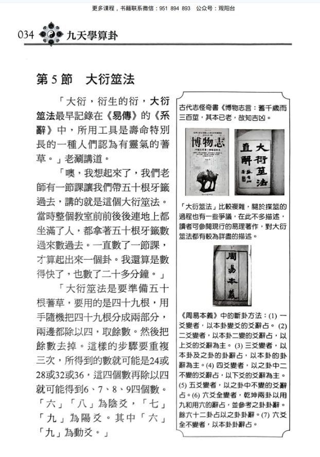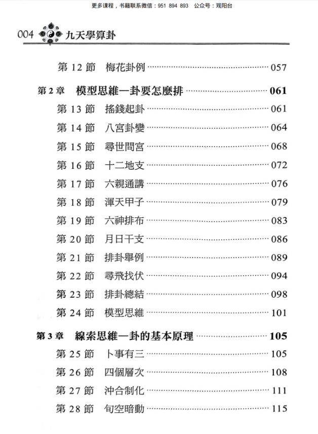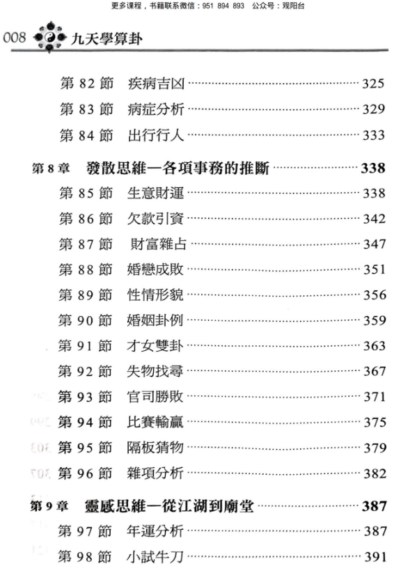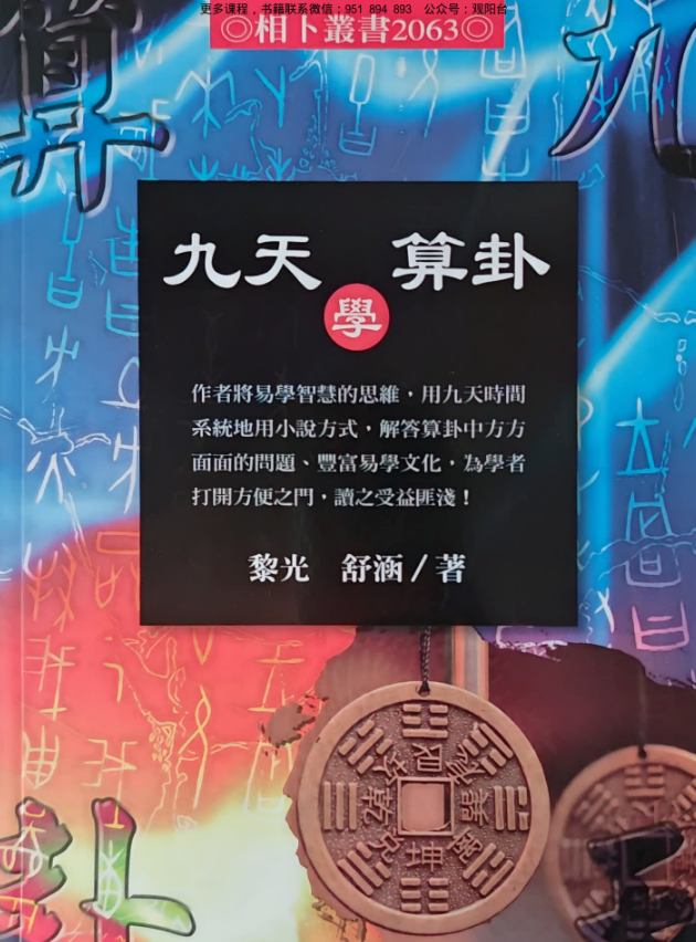 黎光 九天学算卦.pdf 514页,高清晰版本。一套很好的六爻学习教材,九天可能未必能学会,除非你基础扎实,甚至已经学习过一段时间,否则六爻并不很容易掌握。