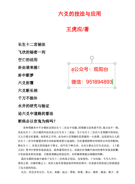 六爻的技法与运用——王虎应16页.pdf,王虎应老师在长期的实践中破译了长生十二宫的真正用法,反复使用,十分应验,今写入书中,泄其之密,以飨有缘之士。其实大家在看我前面列举的卦例中,应该意识到里面已经渗透进了这方面的用法,喜欢的朋友不可错过!