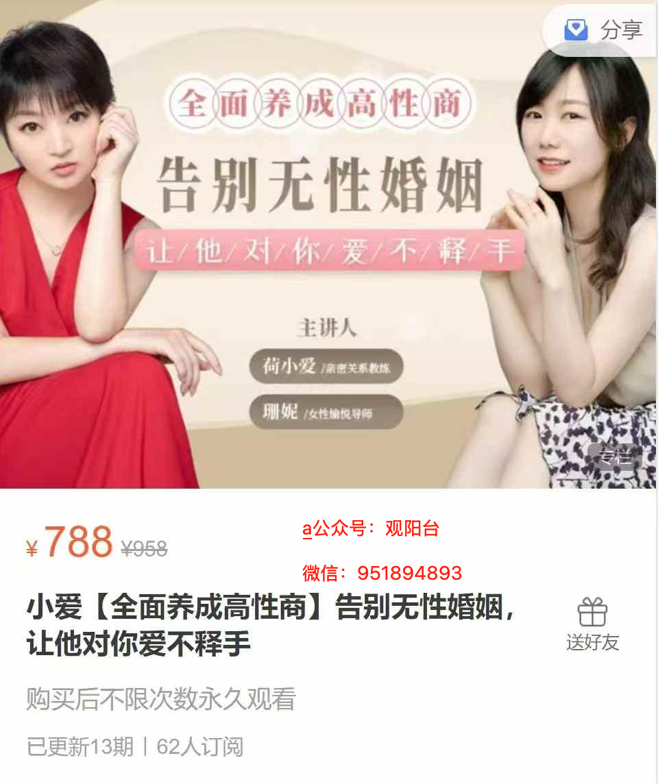 小爱【全面养成高性商】告别无性婚姻,让他对你爱不释手 全13讲视频课 声明:本站所有文章,如无特殊说明或标注,均为本站原创发布。任何个人或组织,在未征得本站同意时,禁止复制、盗用、采集、发布本站内容到任何网站、书籍等各类媒体平台。如若本站内容侵犯了原著者的合法权益,可联系我们进行处理。