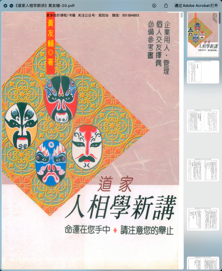 黄友辅-道家人相学新讲.pdf 218页 企业管理,用人,个人交友择偶均可进行参考的道家相学书籍。 声明:本站所有文章,如无特殊说明或标注,均为本站原创发布。任何个人或组织,在未征得本站同意时,禁止复制、盗用、采集、发布本站内容到任何网站、书籍等各类媒体平台。如若本站内容侵犯了原著者的合法权益,可联系我们进行处理。