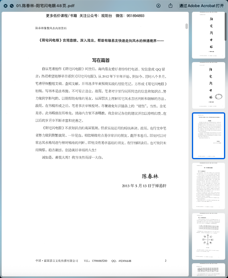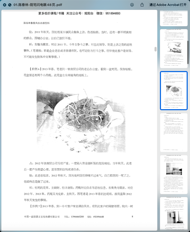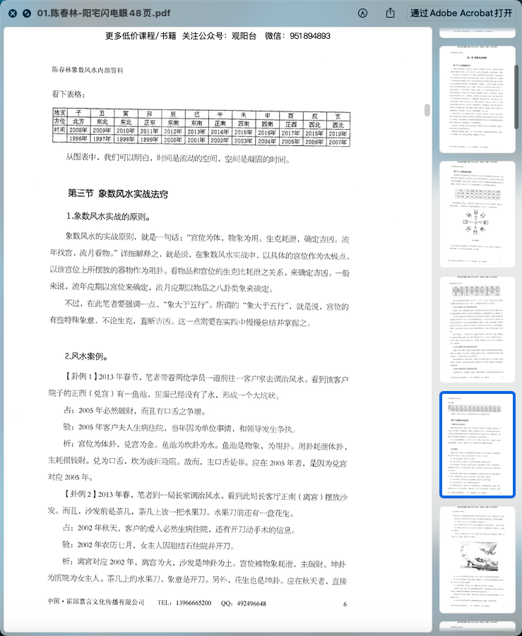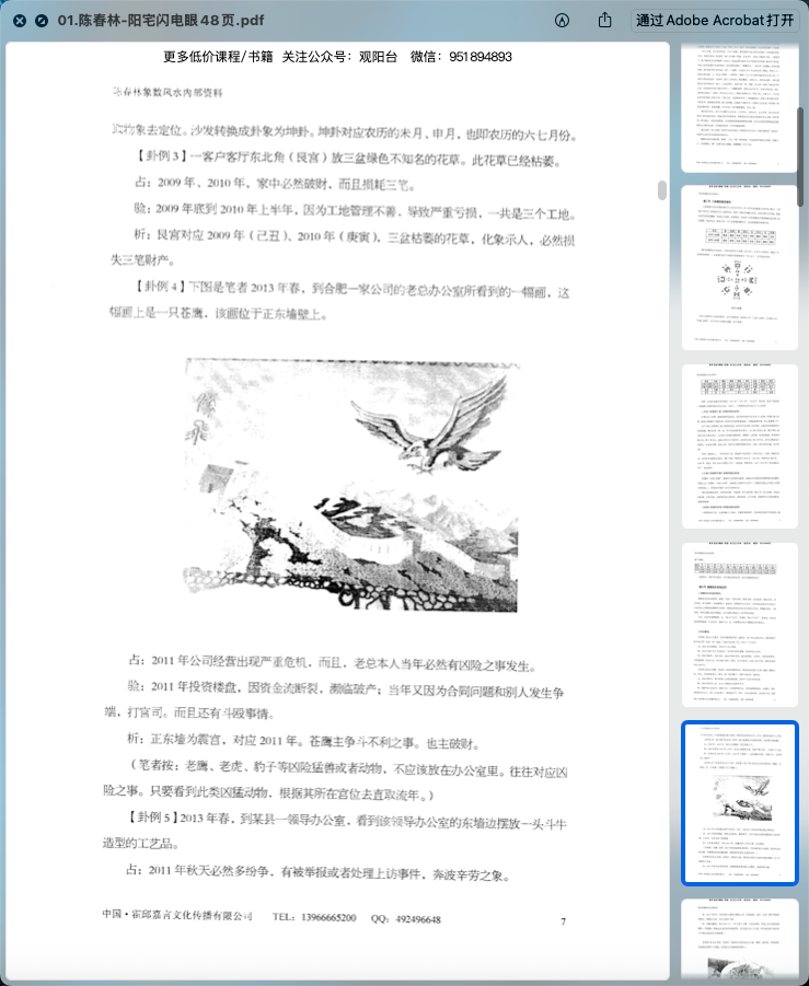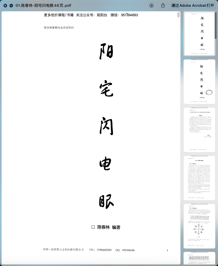 陈春林-阳宅闪电眼.pdf,48页。讲解八卦风水,或者可以说是用梅花易数的思维去看风水,有兴趣的可以看看,强调快狠准。 声明:本站所有文章,如无特殊说明或标注,均为本站原创发布。任何个人或组织,在未征得本站同意时,禁止复制、盗用、采集、发布本站内容到任何网站、书籍等各类媒体平台。如若本站内容侵犯了原著者的合法权益,可联系我们进行处理。