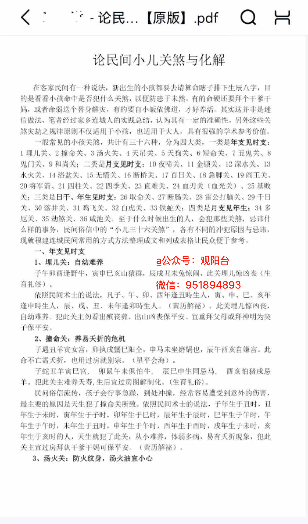 在客家民间有一种说法,新出生的小孩都要去请算命瞎子排下生辰八字,目的是看看小孩命中是否犯什么关煞,以便防忠于未然。有的命硬还要拜个干爹干妈,或者命弱送个替身解灾,有的要自小皈依佛道,才好养活。其实这并非是迷信做法,笔者经过家乡连城人的实践总结,认为其有一定的准确性,另外这些关煞灾劫之规律原则不仅适用于小孩,也适用于大人,具有很强的学术参考价值。