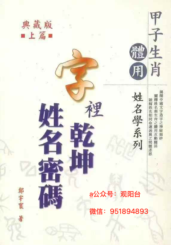 甲子生肖体用姓名学《字里乾坤 姓名密码》郑宇寰 上下两册 共664页 电子版 声明:本站所有文章,如无特殊说明或标注,均为本站原创发布。任何个人或组织,在未征得本站同意时,禁止复制、盗用、采集、发布本站内容到任何网站、书籍等各类媒体平台。如若本站内容侵犯了原著者的合法权益,可联系我们进行处理。
