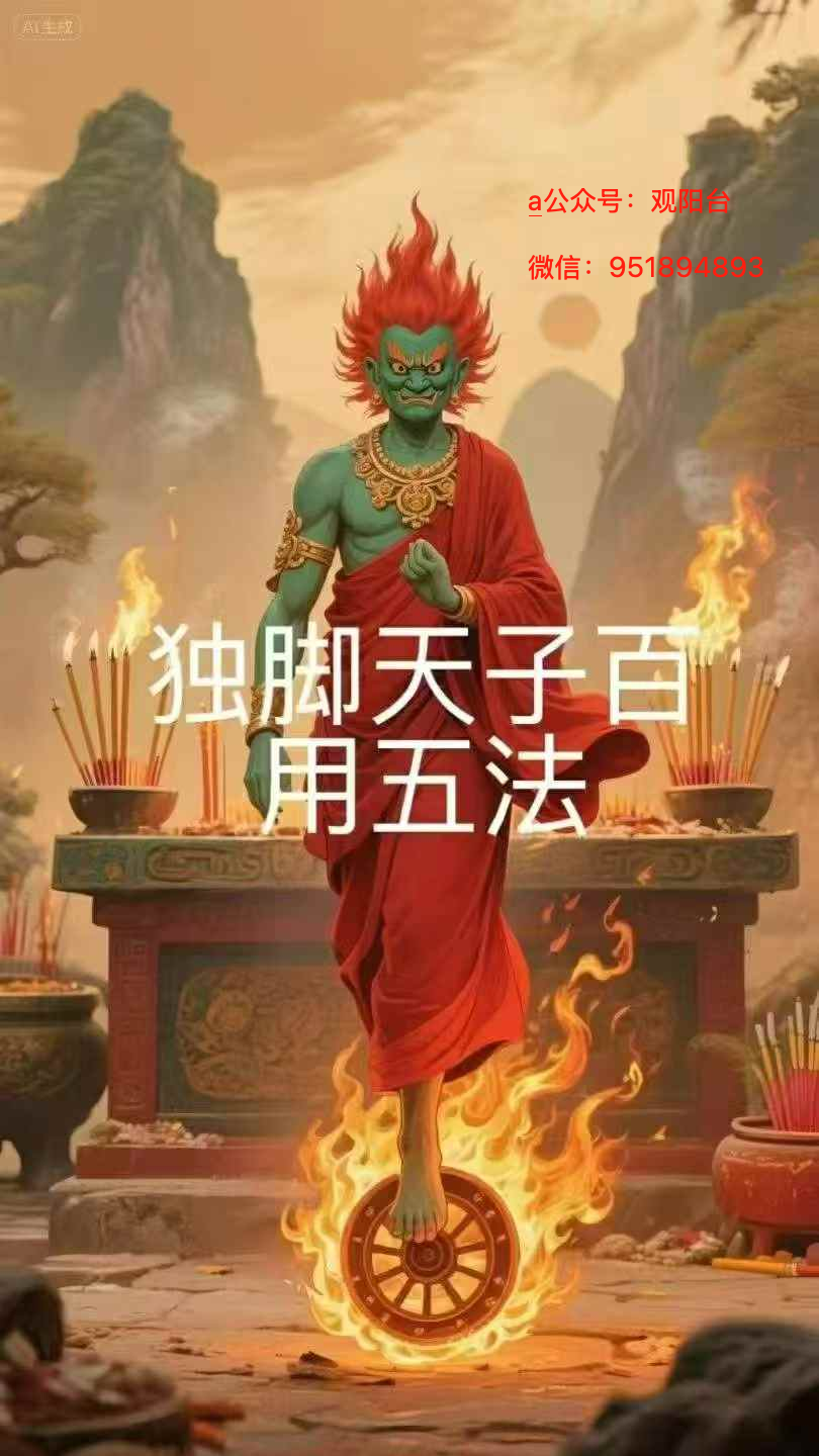 (本法是万用之法,可用于招财祈福庇护,招领贵人,趋吉避凶,震慢恶鬼,巧妙运用可达万用之法,独脚天子作为凶神,管束山上一切作恶精怪,所以古时候对于山上的居民也是祭祀的重要神明。)