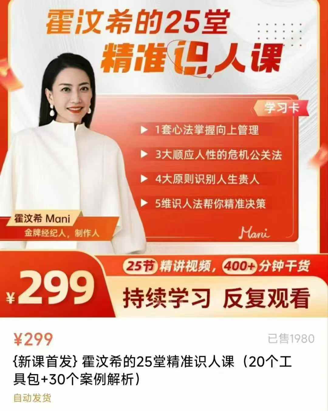 英皇(北京)文化发展有限公司CEO、金牌经纪人霍汶希官宣《霍汶希的25堂识人课》课程正式上线,并在陆续更新。课程中将自己三十多年在娱乐圈的工作经验,明星筛选术转化为成长指南!课程直击当代年轻人在职场及生活中遇到的困扰问题,精准破局,识人有道。毕业战场生存战?金牌经纪带你做自己的经纪人。霍汶希首次拆解自己在娱乐圈30年运作的核心密码——当年还是新人的她如何靠“精准价值锚点”让大佬记住:帮艺人争取机会时,为何永远带着“你能给对方什么”的解决方案;巨星危难时刻只找她的真相,是“信任银行”里存够了长期信用资产;最绝的是“资源杠杆术”,把弱关系变成强支持的经典案例。一直以来,霍汶希在娱乐圈的成绩有目共睹,经她之手,谢霆锋、容祖儿、惠英红、陈伟霆、李克勤、古巨基、Twins、关智斌、白冰等众多艺人成为了家喻户晓的明星。她对艺人的精准挖掘和培养,以及面对各种危机时展现出的强大公关能力,都让人对她的专业能力赞叹不已。此次,她强势进军职场赛道。这一果断的举动,也展现了她一贯的雷厉风行的风格。 据了解,此次课程上线之前,霍汶希就在社交媒体上分享自己从事经纪人行业的工作经验,网友们纷纷留言表示希望可以得到系统性的分享。或许是感受到了大家的热情,课程如今火速上线。在课程内容方面,霍汶希将自己多年在娱乐圈摸爬滚打的经验融入其中,从如何精准识人,到打造个人职场魅力,再到应对职场危机,干货满满。她以娱乐圈的真实案例为切入点,深入浅出地讲解识人技巧。霍汶希的这门课程识人课,对于渴望拓展人脉、提升自己竞争力的人来说,无疑具有很大的吸引力。也许学完这门课程,你不一定能真的拿到巨星通讯录,但你一定能掌握拓展人脉的技巧和方法,为自己的职场及人生之路打开更多的可能性。
