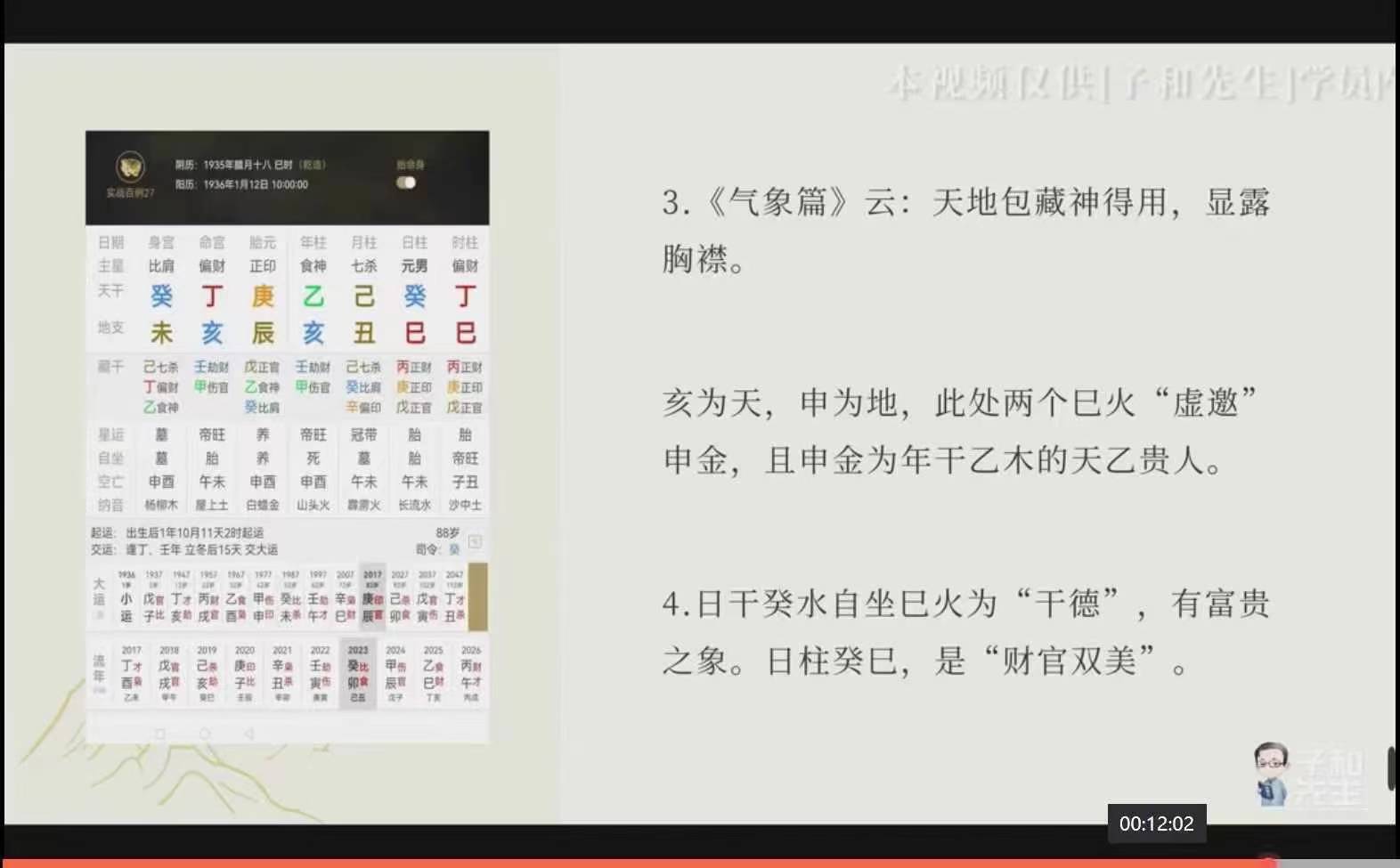 子和先生 八字案例100讲视频,详细解读每个八字案例,格局组合,各项信息,年运吉凶等。 声明:本站所有文章,如无特殊说明或标注,均为本站原创发布。任何个人或组织,在未征得本站同意时,禁止复制、盗用、采集、发布本站内容到任何网站、书籍等各类媒体平台。如若本站内容侵犯了原著者的合法权益,可联系我们进行处理。