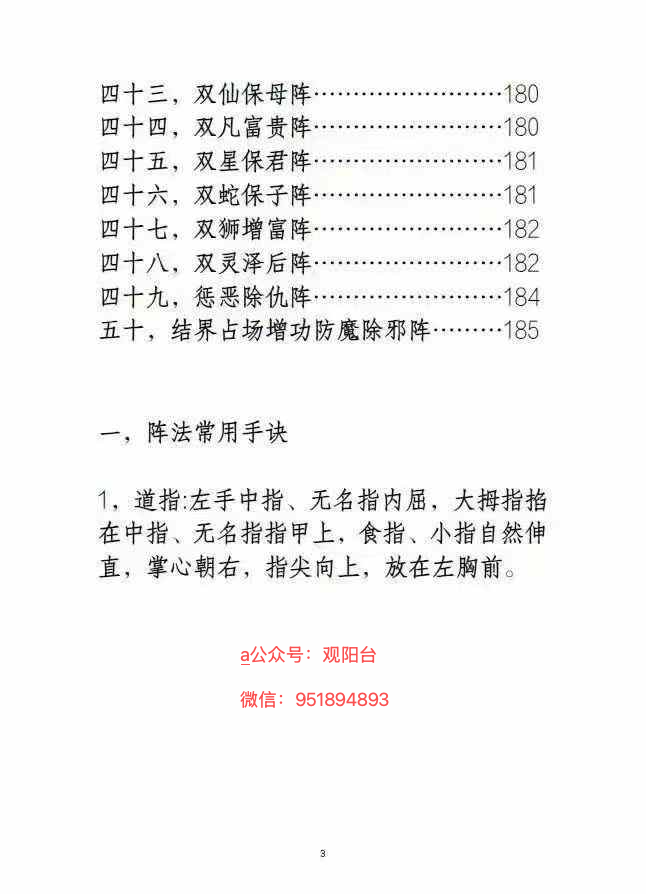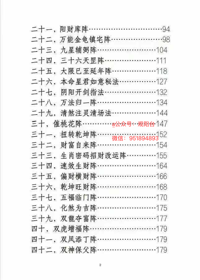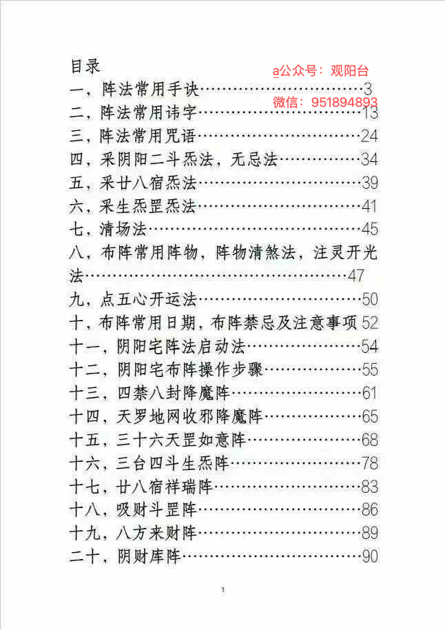 有阵法常用手诀,讳字,咒语,彩阴阳二斗炁法,无忌法,清场法,布阵常用阵物,清煞法,注灵开光法,布阵日期,禁忌及注意事项,阴阳宅阵法启动法,操作步骤,四禁八封降魔阵,三十六天罡如意阵,廿八宿祥瑞阵,吸财斗罡阵,八方来财阵,阴阳财库阵,九星辅弼阵,大限已至延年阵,本命星君如意秘法,万法归一阵,催桃花阵,财富自来阵,五福临门阵,化煞为吉阵,双龙夺富阵,双凤添丁阵,双神保父阵,双仙保母阵,双蛇保子阵,双灵泽后阵,惩恶除仇阵个…等等