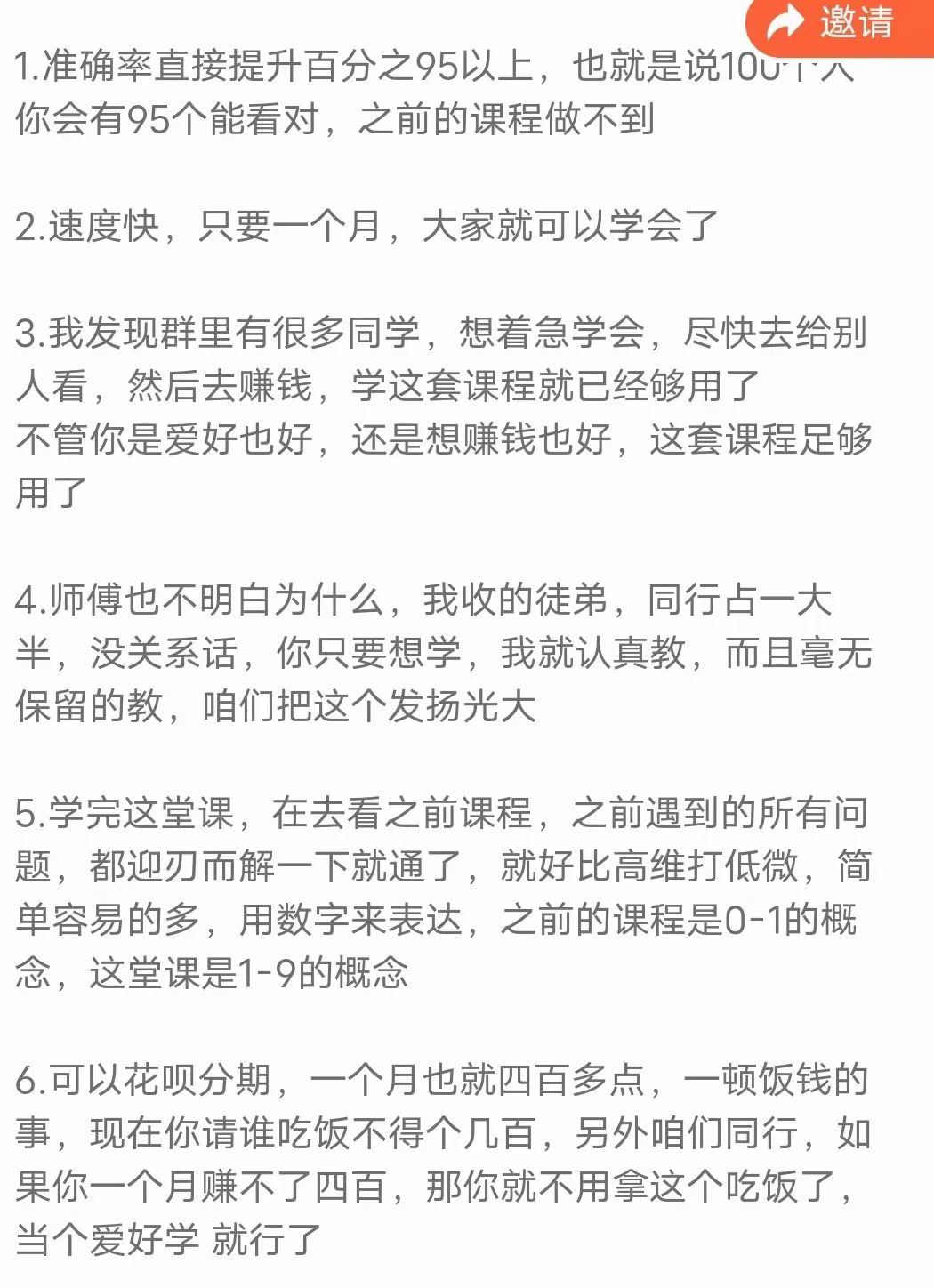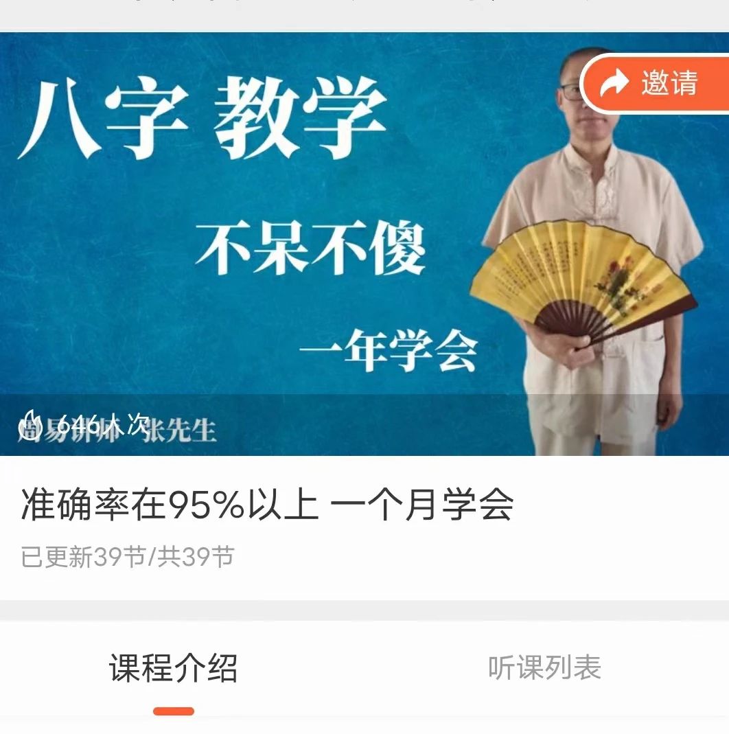 张先生八字预测学课程视频39集,据说学准确率在95%以上,一个月学会。当然,这个是易商的宣传有点夸大成分,一个月想系统的学会八字还是有一定难度的。注意:有易友反馈,课程含金量太低,并且部分理论可能是胡说八道。所以,如果你和讲课的老师不是很熟悉的情况下,不建议学习。